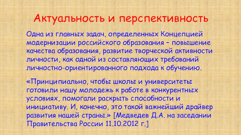 «Принципиально, чтобы школы и университеты готовили нашу молодежь к работе в конкурентных условиях, помогали раскрыть способности и инициативу. И, конечно, это такой важнейший драйвер развития нашей страны.» [Медведев Д.А. на заседании Правительства России 11.10.2012 г.]