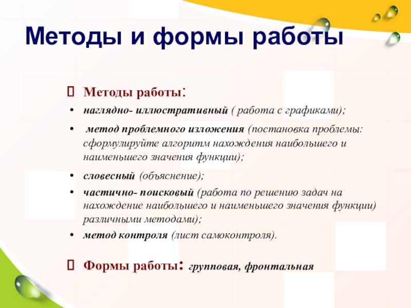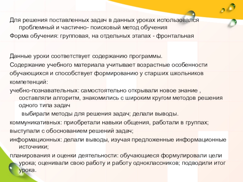 Для решения поставленных задач в данных уроках использовался проблемный и частично- поисковый метод обучения