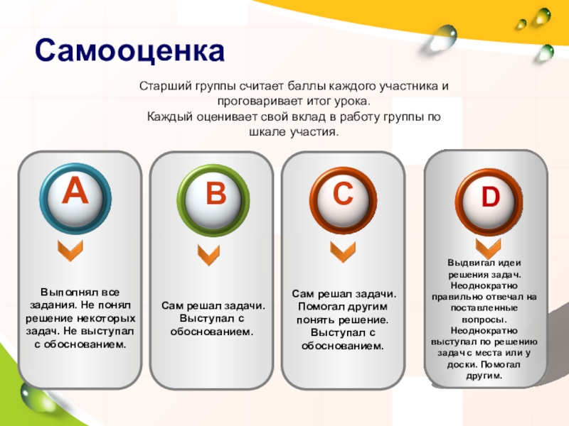 Правильность решения устанавливается учителем. Результат заносится старшим группы в лист самоконтроля.