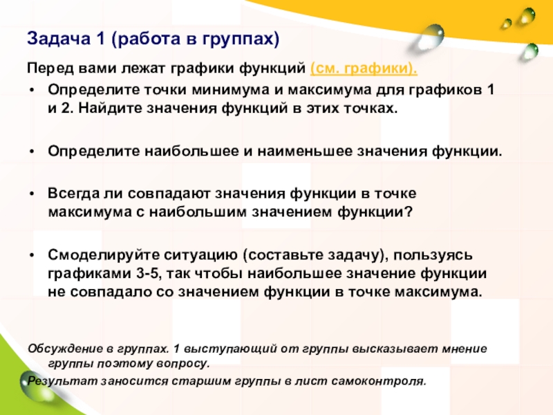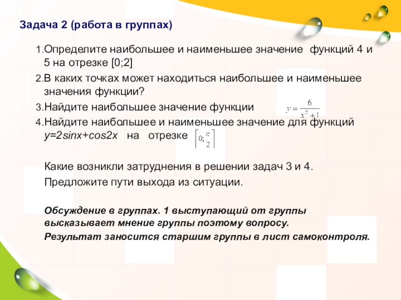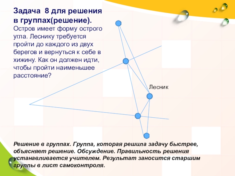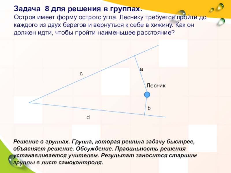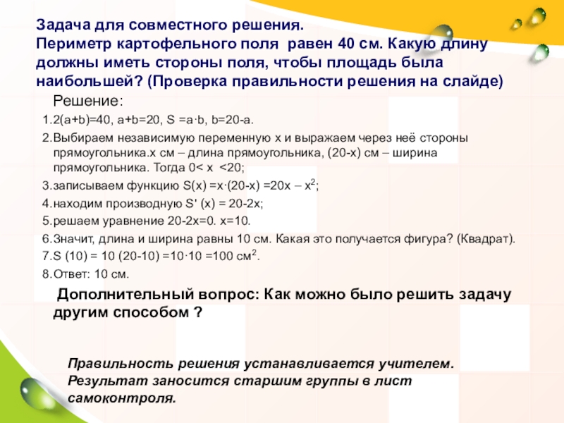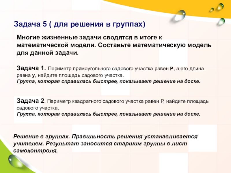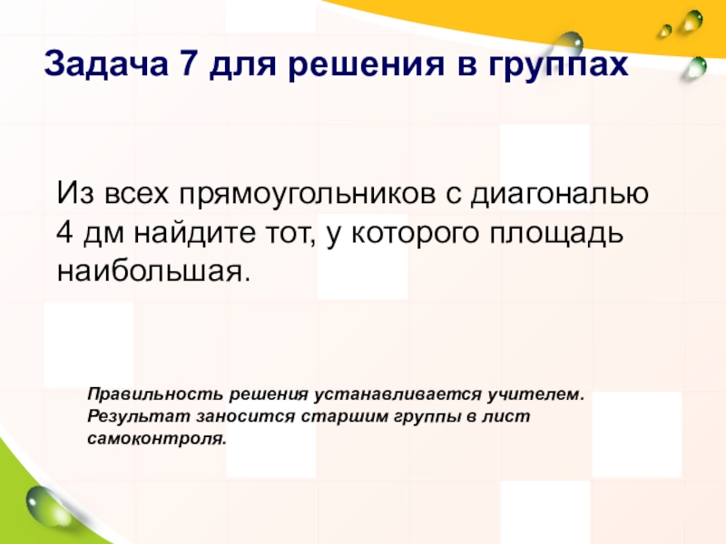 Решение в группах. Группа, которая решила задачу быстрее, объясняет решение. Обсуждение. Правильность решения устанавливается учителем. Результат заносится старшим группы в лист самоконтроля.