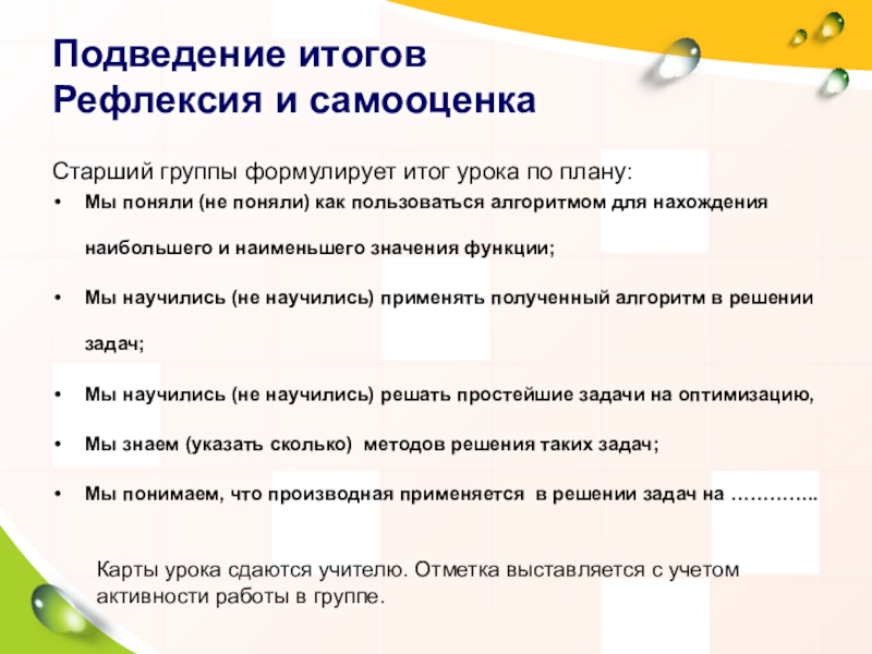 Карты урока сдаются учителю. Отметка выставляется с учетом активности работы в группе.