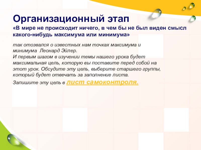 И первым шагом в изучении темы нашего урока будет максимальная цель, которую вы поставите перед собой на этот урок. Обсудите эту цель, выберите старшего группы, который будет отвечать за заполнение листа.