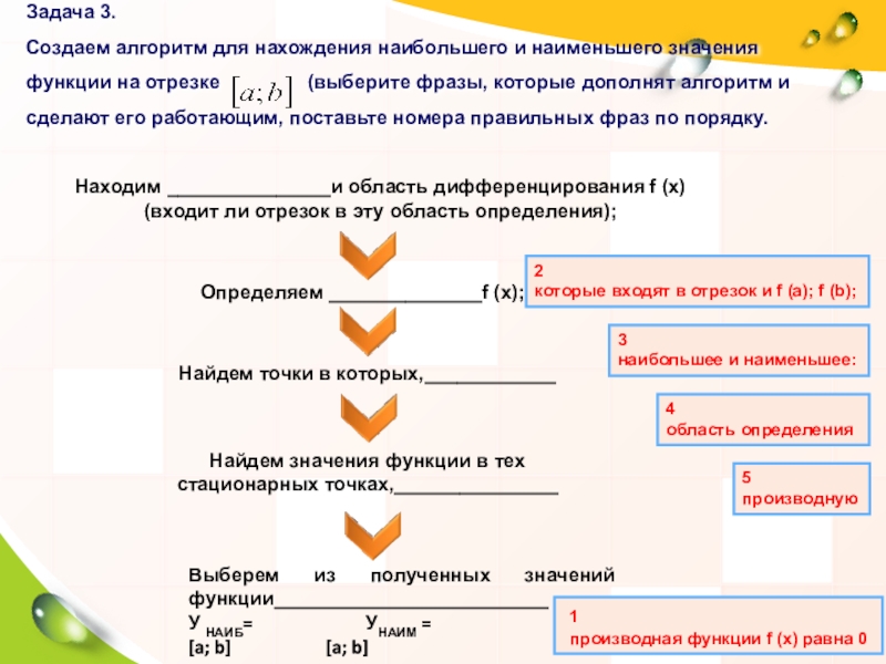Находим _______________и область дифференцирования f (x) (входит ли отрезок в эту область определения);