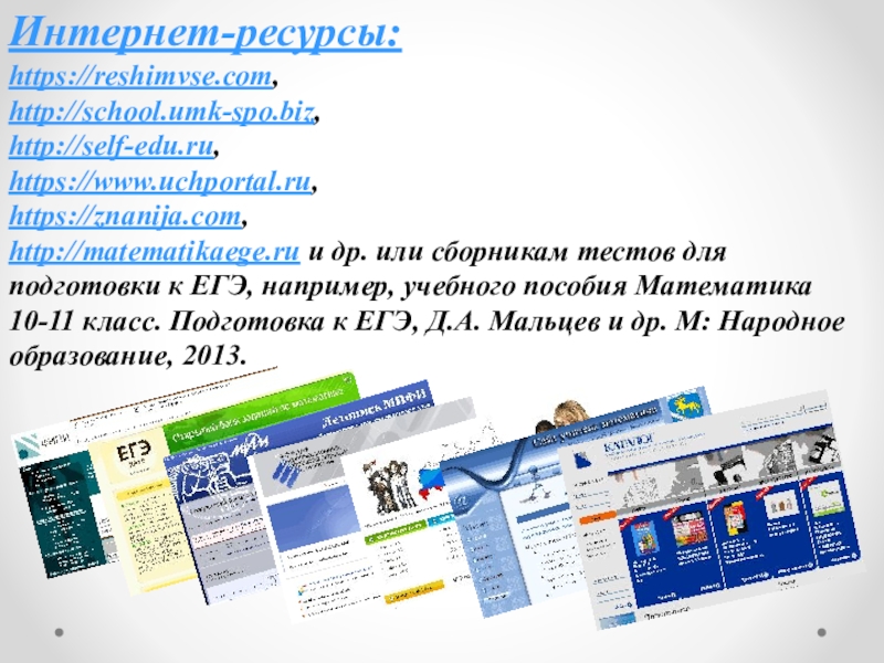 учебного пособия Математика 10-11 класс. Подготовка к ЕГЭ, Д.А. Мальцев и др. М: Народное образование, 2013.
