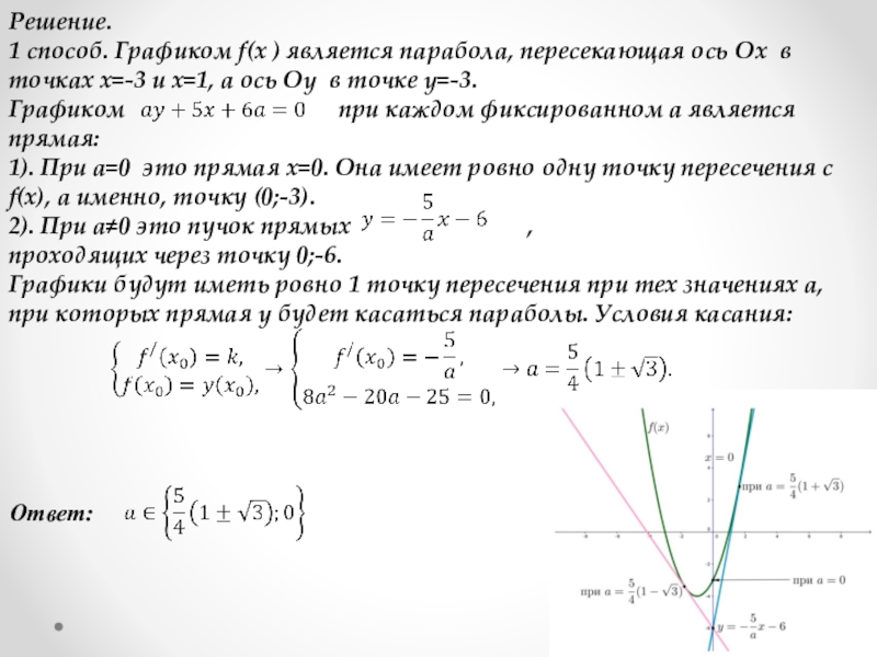 Способ II (графический). В зависимости от задачи (с переменной х и параметром а) рассматриваются графики или в координатной плоскости (х; у), или в координатной плоскости (х; а).