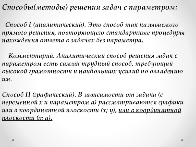 Комментарий. Аналитический способ решения задач с параметром есть самый трудный способ, требующий высокой грамотности и наибольших усилий по овладению им.