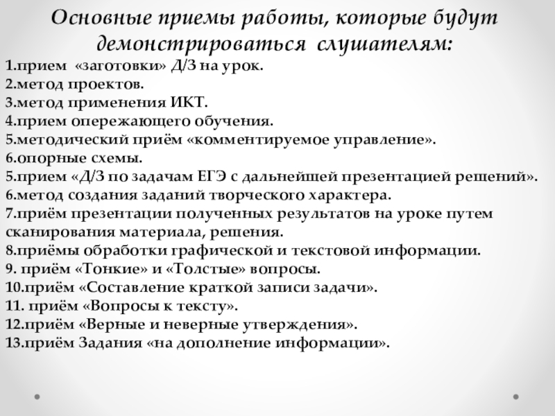 Слайд 9Основные приемы работы, которые будут демонстрироваться слушателям: