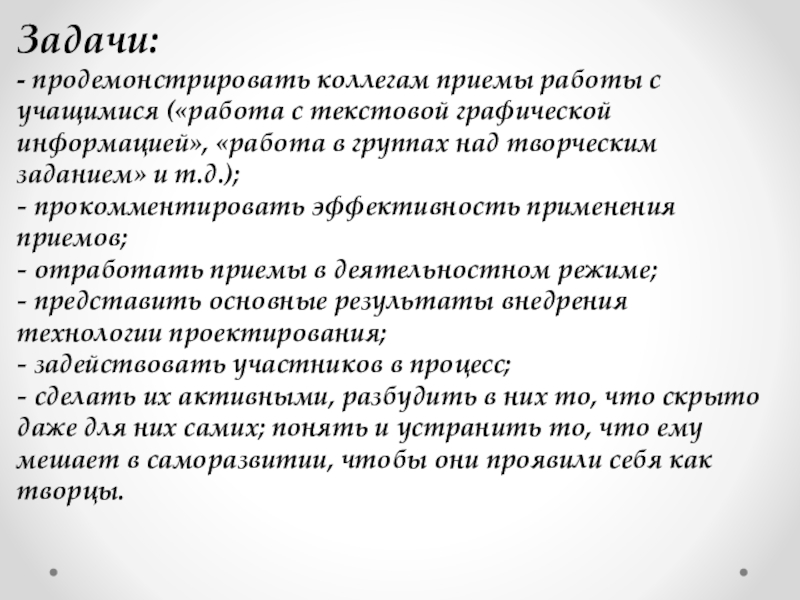 - продемонстрировать коллегам приемы работы с учащимися («работа с текстовой графической