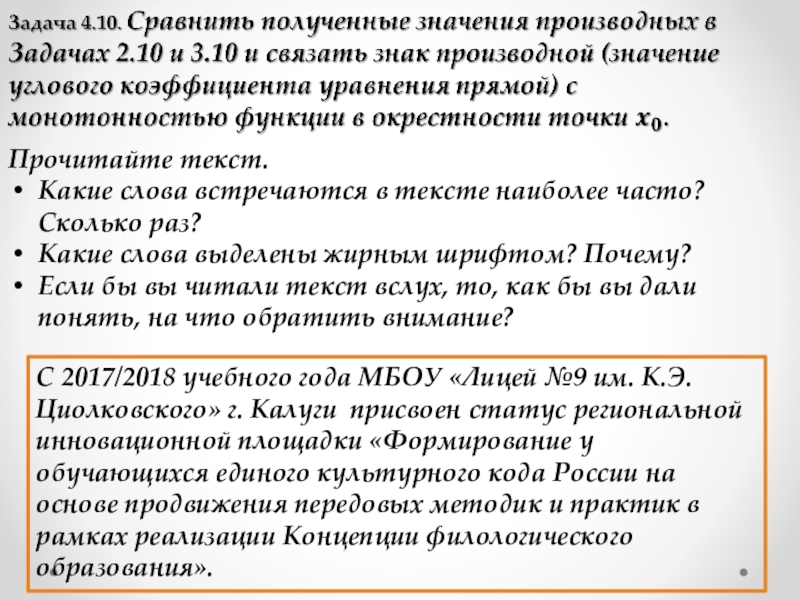 С 2017/2018 учебного года МБОУ «Лицей №9 им. К.Э. Циолковского» г. Калуги присвоен статус региональной инновационной площадки «Формирование у обучающихся единого культурного кода России на основе продвижения передовых методик и практик в рамках реализации Концепции филологического образования».