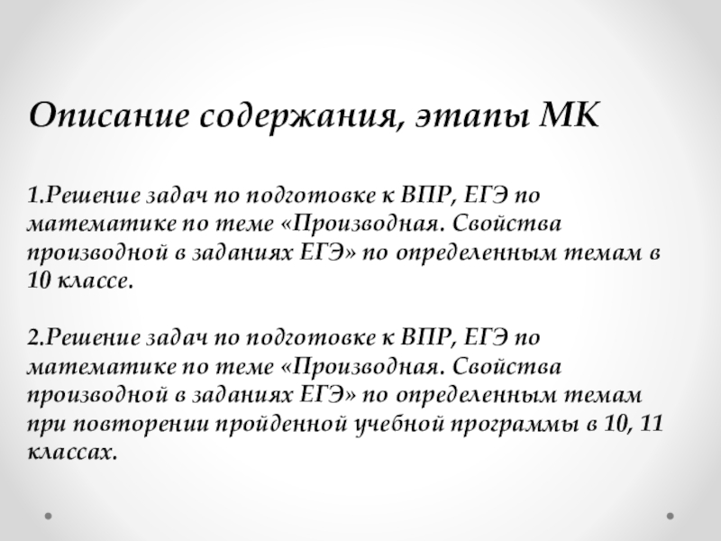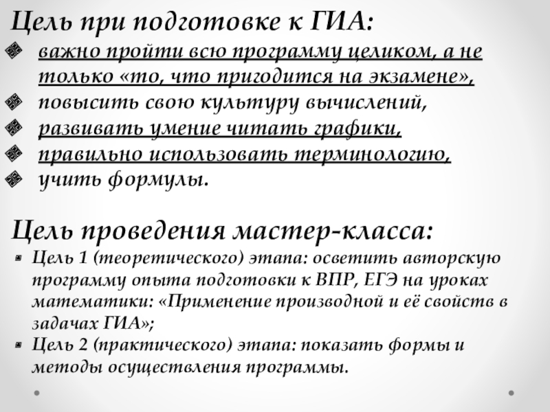 Цель 1 (теоретического) этапа: осветить авторскую программу опыта подготовки к ВПР, ЕГЭ на уроках математики: «Применение производной и её свойств в задачах ГИА»;
