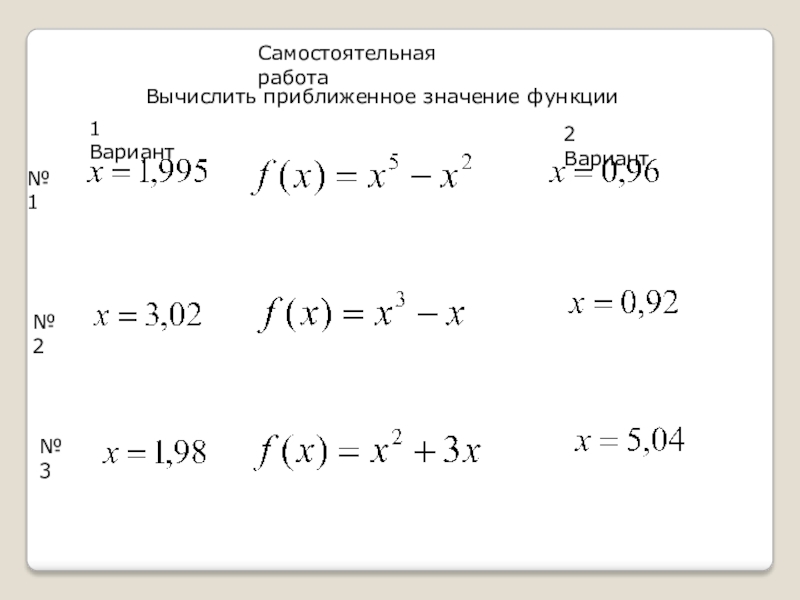 Самостоятельная  работа1 Вариант2 Вариант№ 1№ 2№ 3Вычислить приближенное значение функции