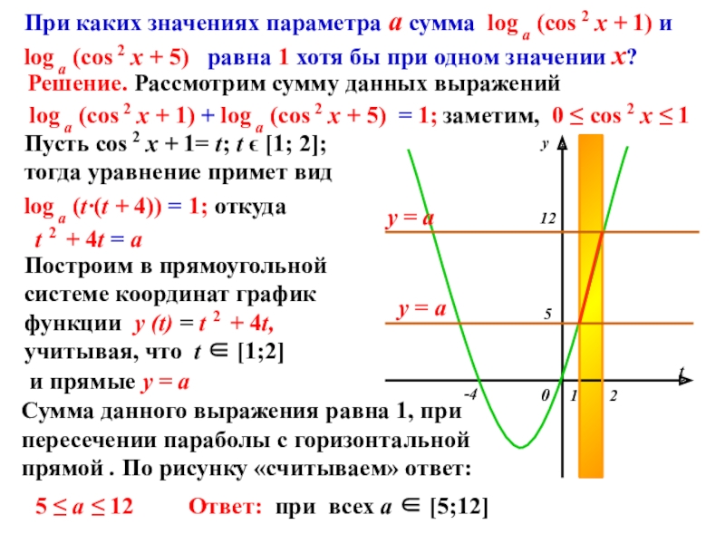 При каких значениях параметра а сумма log a (cos 2 x + 1) и log a (cos 2 x + 5) равна 1 хотя бы при одном значении х?