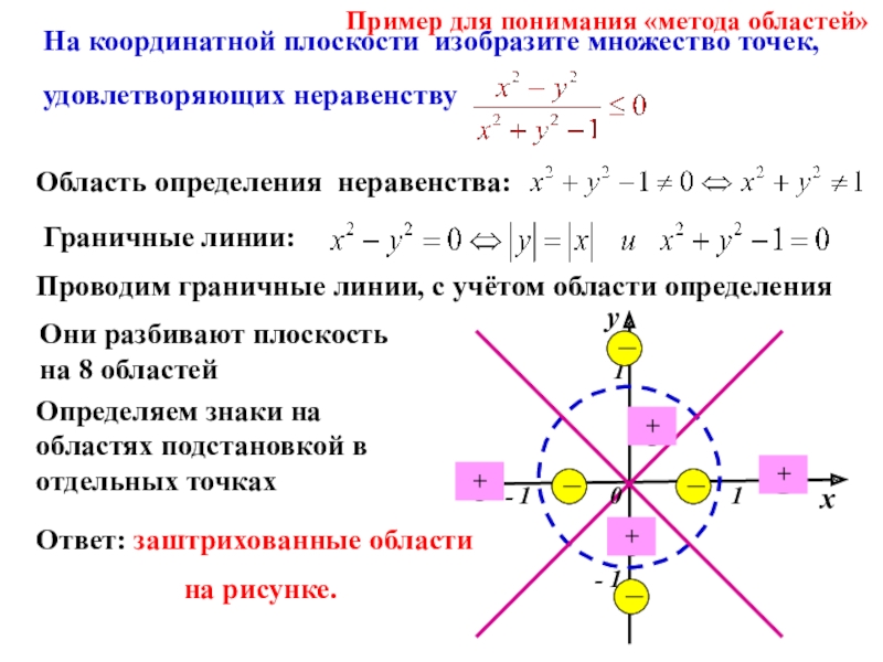 2) Определим знаки в полученных пяти областях, и укажем решение данного неравенства.