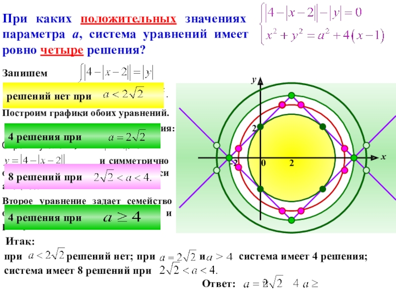 Второе уравнение задает семейство окружностей с центром (2;0) и радиусом а.