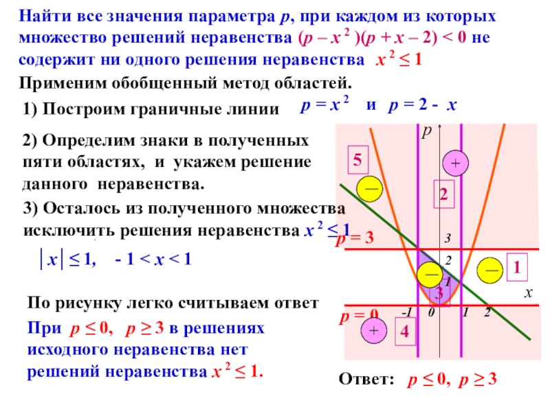 При р ≤ 0, р ≥ 3 в решениях исходного неравенства нет решений неравенства х 2 ≤ 1.