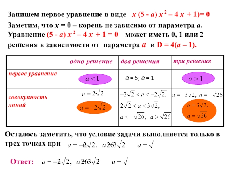 Заметим, что х = 0 – корень не зависимо от параметра а. Уравнение (5 - а) х 2 – 4 х + 1 = 0 может иметь 0, 1 или 2 решения в зависимости от параметра а и D = 4(a – 1).
