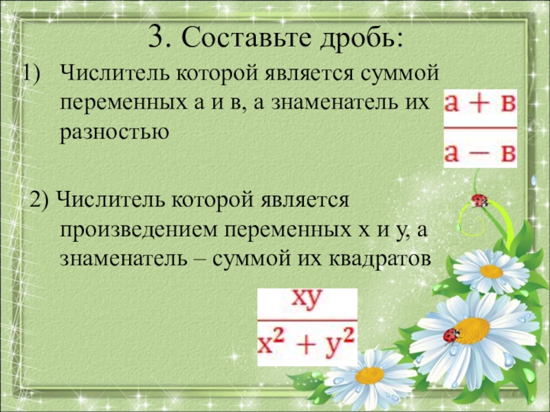 3. Составьте дробь:Числитель которой является суммой переменных а и в, а знаменатель их разностью2) Числитель которой является