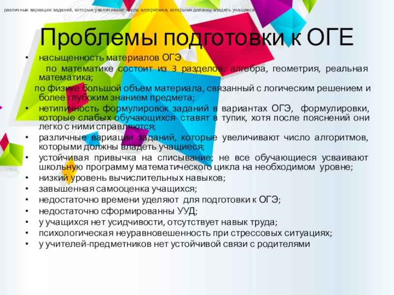 нетипичность формулировок заданий в вариантах ОГЭ, формулировки, которые слабых обучающихся ставят в тупик, хотя после пояснений они легко с ними справляются;