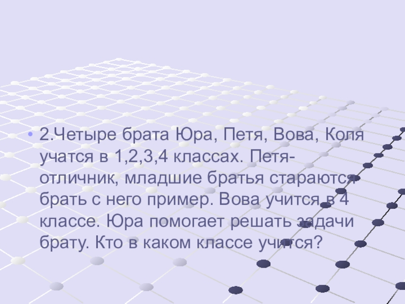 2.Четыре брата Юра, Петя, Вова, Коля учатся в 1,2,3,4 классах. Петя-