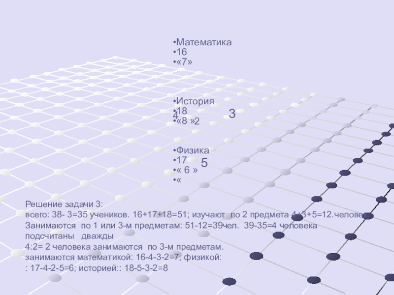 предмета 4+3+5=12.человек. Занимаются по 1 или 3-м предметам: 51-12=39чел. 39-35=4 человека подсчитаны дважды