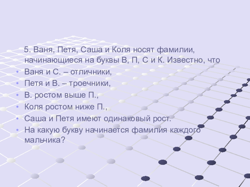 Слайд 37 5. Ваня, Петя, Саша и Коля носят фамилии, начинающиеся