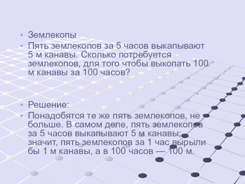 Понадобятся те же пять землекопов, не больше. В самом деле, пять землекопов за 5 часов выкапывают 5 м канавы; значит, пять землекопов за 1 час вырыли бы 1 м канавы, а в 100 часов — 100 м.