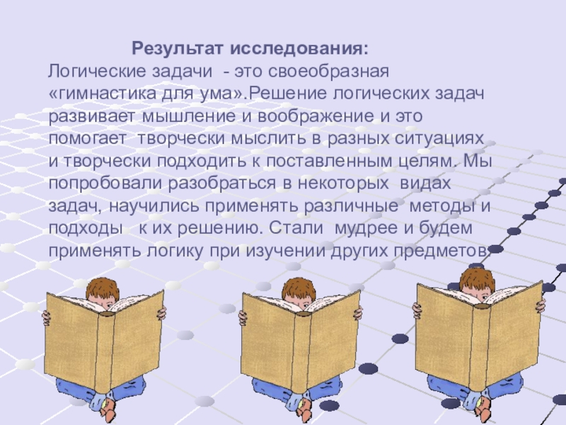 Логические задачи - это своеобразная «гимнастика для ума».Решение логических задач развивает мышление и воображение и это помогает творчески мыслить в разных ситуациях и творчески подходить к поставленным целям. Мы попробовали разобраться в некоторых видах задач, научились применять различные методы и подходы к их решению. Стали мудрее и будем применять логику при изучении других предметов.