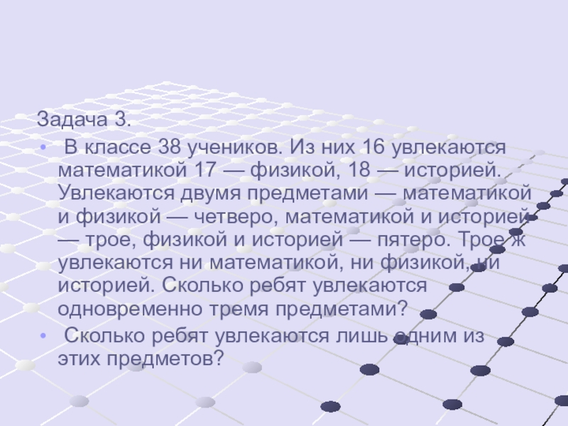 17 — физикой, 18 — историей. Увлекаются двумя предметами — математикой и физикой — четверо, математикой и историей — трое, физикой и историей — пятеро. Трое ж увлекаются ни математикой, ни физикой, ни историей. Сколько ребят увлекаются одновременно тремя предметами?