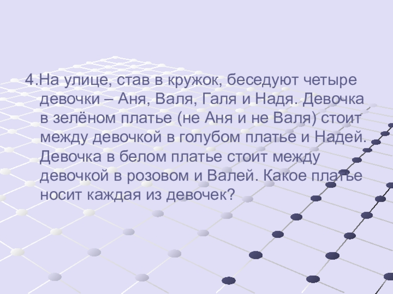 4.На улице, став в кружок, беседуют четыре девочки – Аня, Валя,