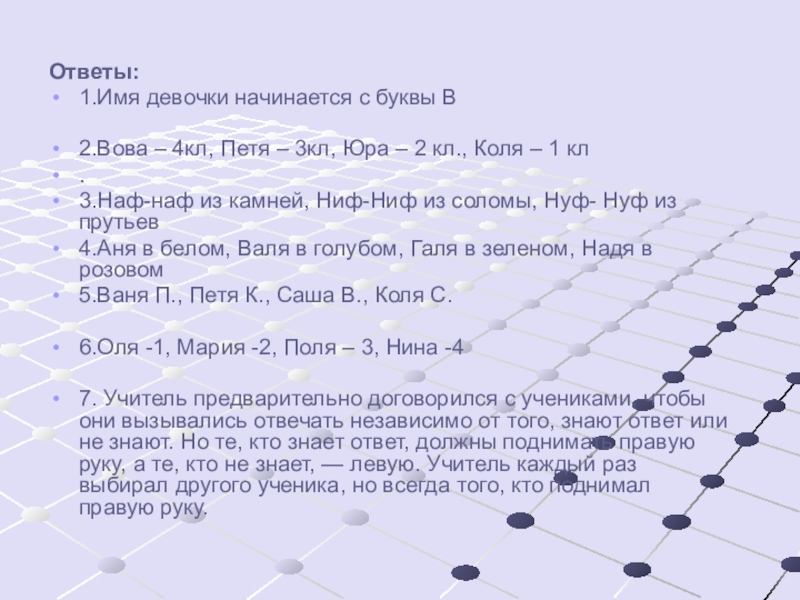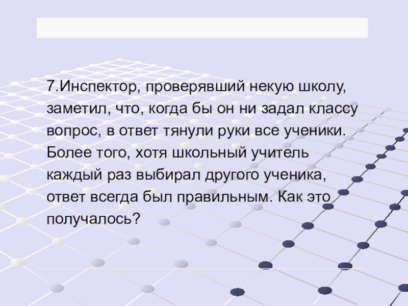 7. Учитель предварительно договорился с учениками, чтобы они вызывались отвечать независимо от того, знают ответ или не знают. Но те, кто знает ответ, должны поднимать правую руку, а те, кто не знает, — левую. Учитель каждый раз выбирал другого ученика, но всегда того, кто поднимал правую руку.