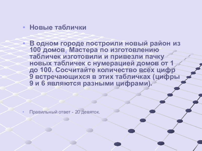 по изготовлению табличек изготовили и привезли пачку новых табличек с нумерацией домов от 1 до 100. Сосчитайте количество всех цифр 9 встречающихся в этих табличках (цифры 9 и 6 являются разными цифрами).