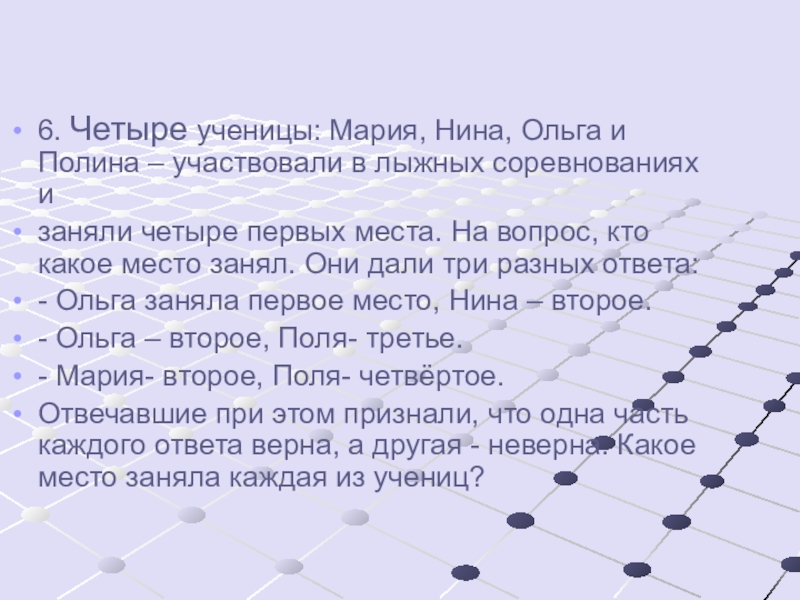 6.Оля -1, Мария -2, Поля – 3, Нина -4