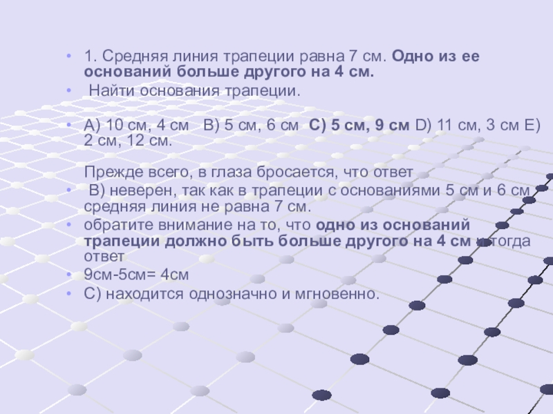 1. Средняя линия трапеции равна 7 см. Одно из ее оснований