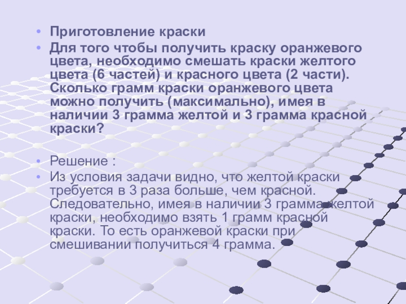 желтого цвета (6 частей) и красного цвета (2 части). Сколько грамм краски оранжевого цвета можно получить (максимально), имея в наличии 3 грамма желтой и 3 грамма красной краски?