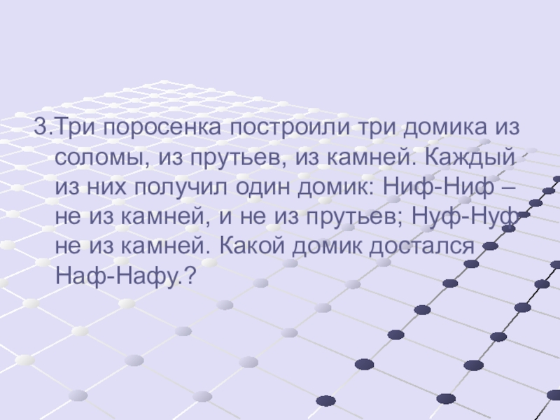 Каждый из них получил один домик: Ниф-Ниф – не из камней, и не из прутьев; Нуф-Нуф не из камней. Какой домик достался Наф-Нафу.?
