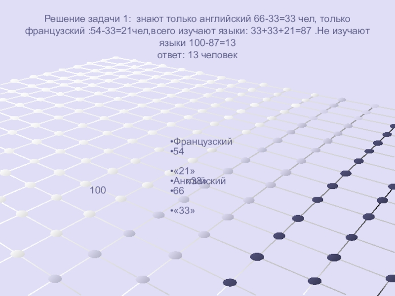 Слайд 18Решение задачи 1: знают только английский 66-33=33 чел, только французский :54-33=21чел,всего