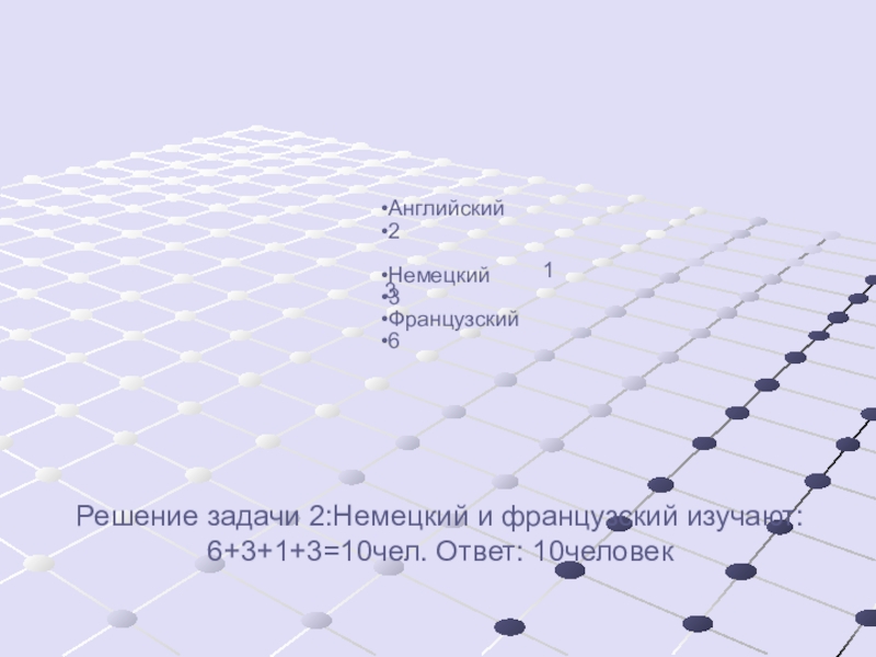 Слайд 19Решение задачи 2:Немецкий и французский изучают: 6+3+1+3=10чел. Ответ: 10человек