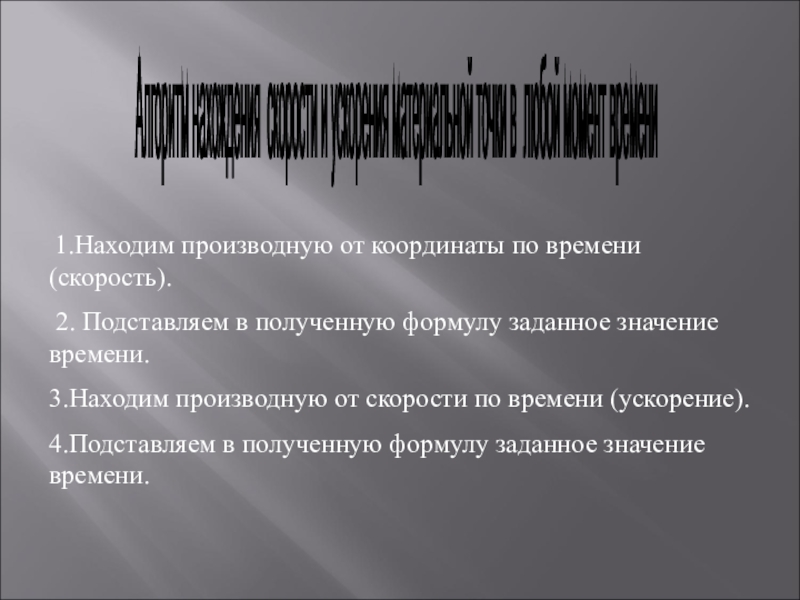 Слайд 17Алгоритм нахождения скорости и ускорения материальной точки в любой момент времени