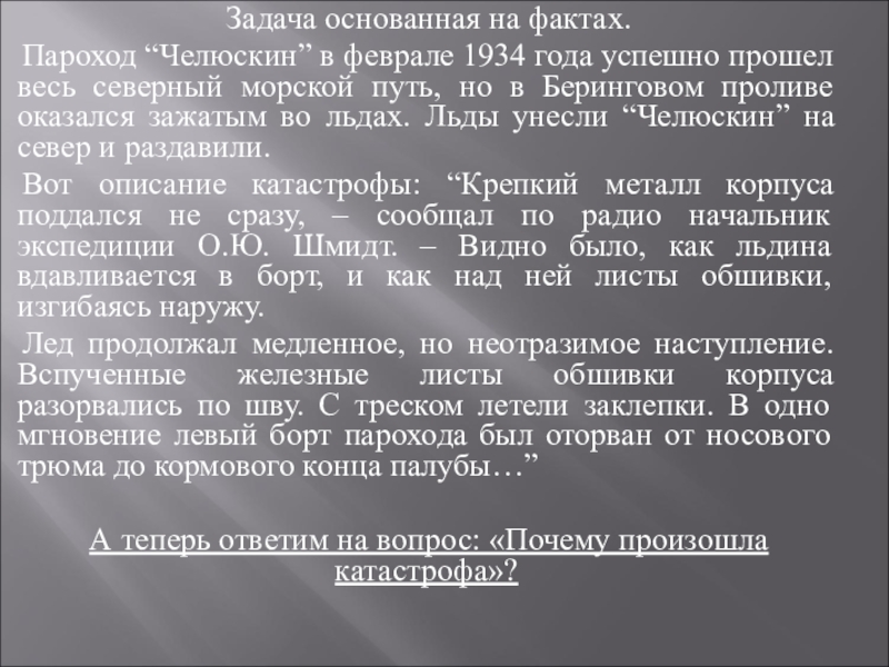 Вот описание катастрофы: “Крепкий металл корпуса поддался не сразу, – сообщал по радио начальник экспедиции О.Ю. Шмидт. – Видно было, как льдина вдавливается в борт, и как над ней листы обшивки, изгибаясь наружу.