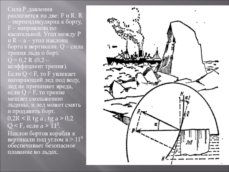 перпендикулярна к борту, F – направлена по касательной. Угол между P и R – a – угол наклона борта к вертикали. Q – сила трения льда о борт.