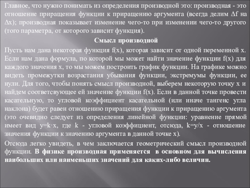 отношение приращения функции к приращению аргумента (всегда делим Δf на Δx); производная показывает изменение чего-то при изменении чего-то другого (того параметра, от которого зависит функция).