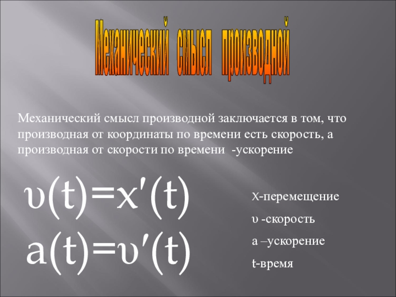 Слайд 16Механический смысл производной заключается в том, что производная от координаты по