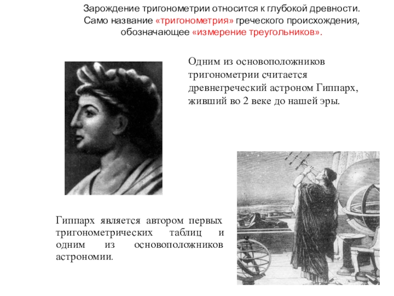 Одним из основоположников тригонометрии считается древнегреческий астроном Гиппарх, живший во 2 веке до нашей эры.