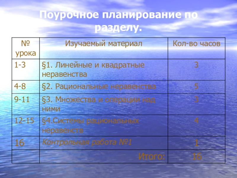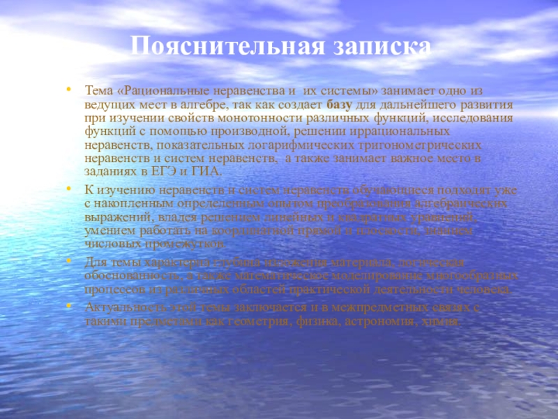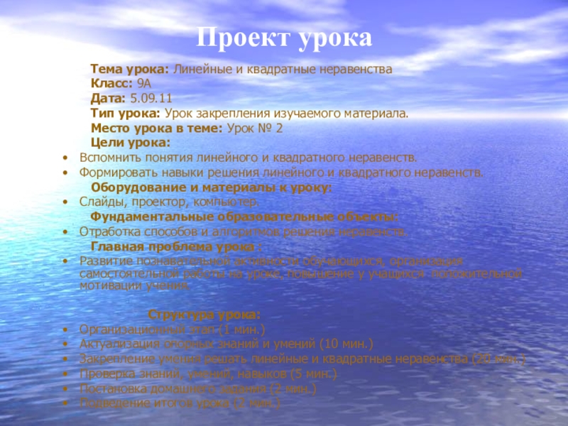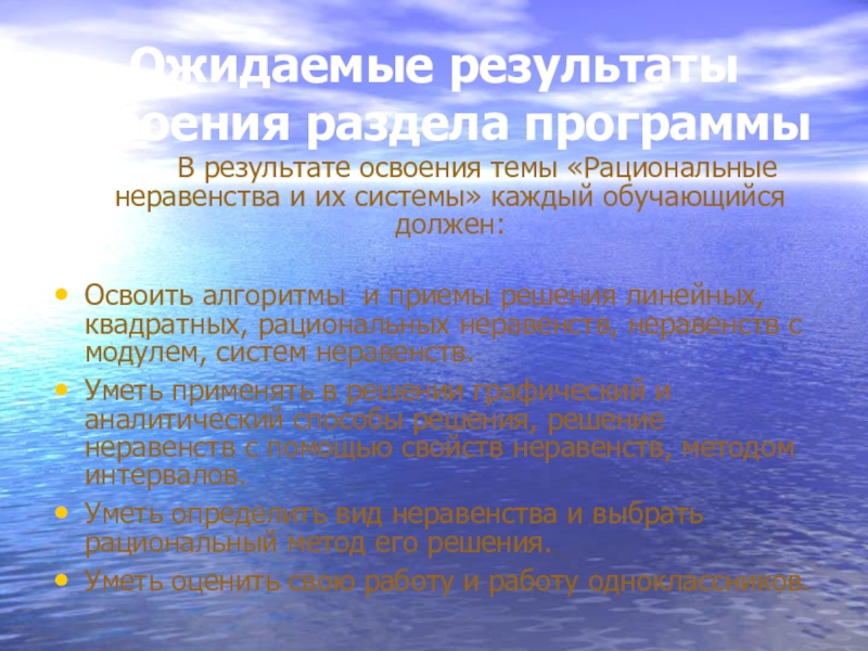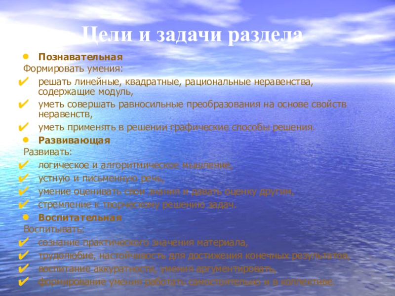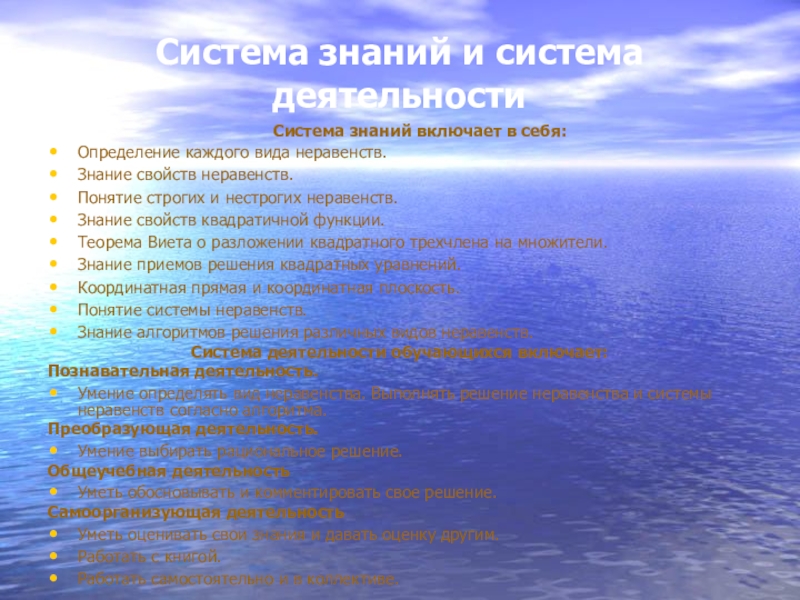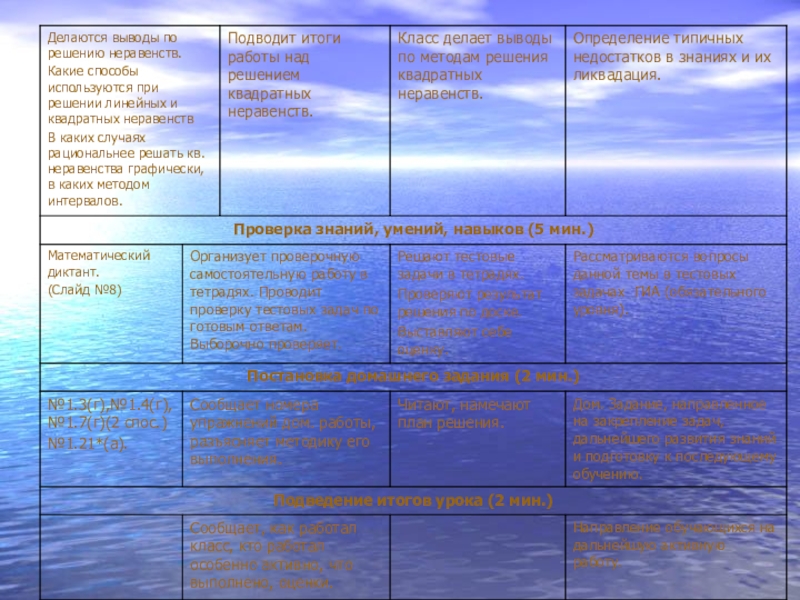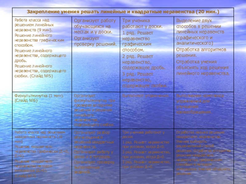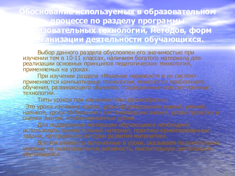 При изучении раздела «Решение неравенств и их систем» применяются компьютерные технологии, технологии проблемного обучения, развивающего обучения, традиционные классно-урочные технологии.