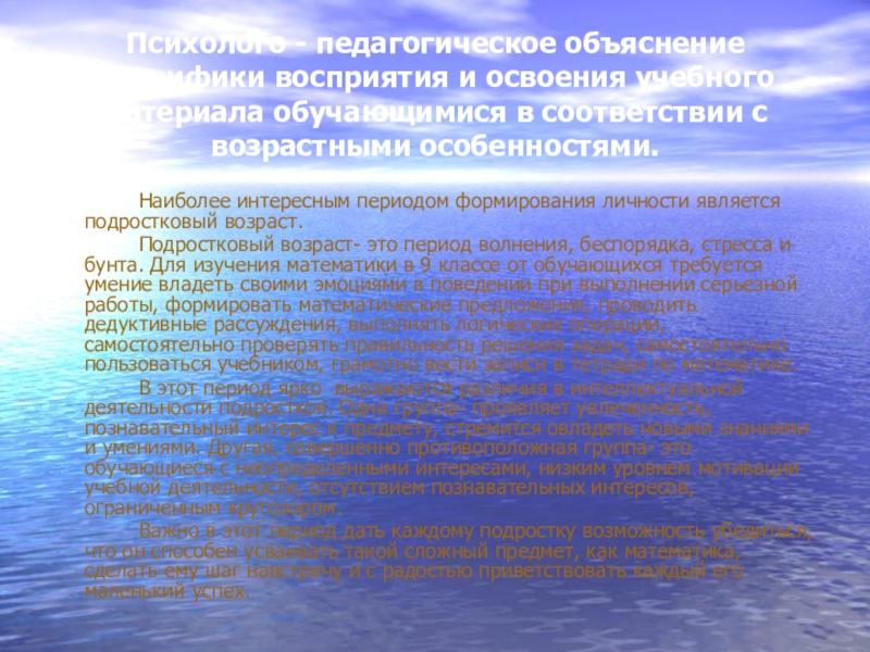 Подростковый возраст- это период волнения, беспорядка, стресса и бунта. Для изучения математики в 9 классе от обучающихся требуется умение владеть своими эмоциями в поведении при выполнении серьезной работы, формировать математические предложения, проводить дедуктивные рассуждения, выполнять логические операции, самостоятельно проверять правильность решения задач, самостоятельно пользоваться учебником, грамотно вести записи в тетради по математике.
