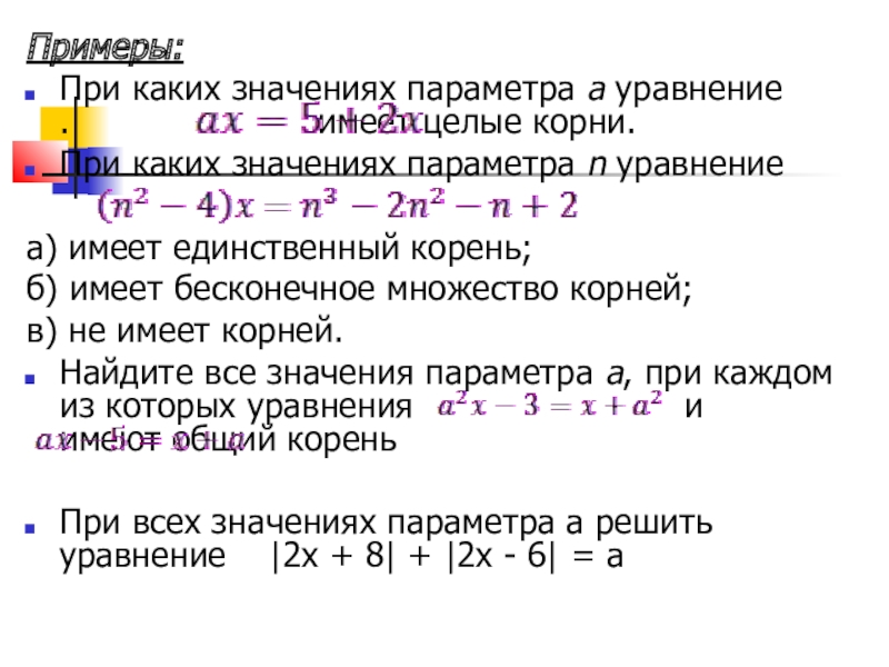 б) Если а = 5, то 0х = 0, следовательно, любое х есть решение.