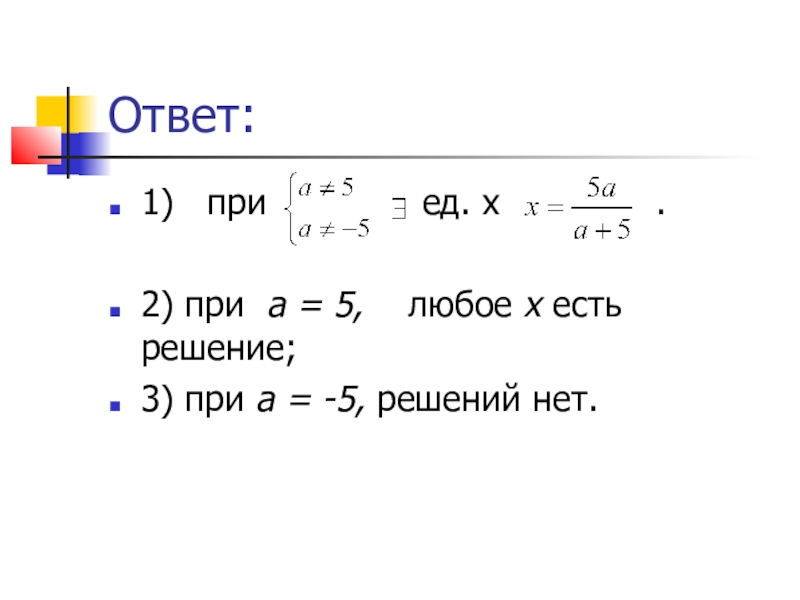 в) Если а = - 5, то 0х = 250, следовательно, решений нет.