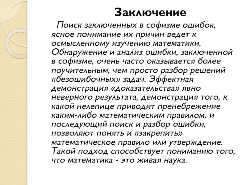 Поиск заключенных в софизме ошибок, ясное понимание их причин ведет к осмысленному изучению математики. Обнаружение и анализ ошибки, заключенной в софизме, очень часто оказывается более поучительным, чем просто разбор решений «безошибочных» задач. Эффектная демонстрация «доказательства» явно неверного результата, демонстрация того, к какой нелепице приводит пренебрежение каким-либо математическим правилом, и последующий поиск и разбор ошибки, позволяют понять и «закрепить» математическое правило или утверждение. Такой подход способствует пониманию того, что математика - это живая наука.