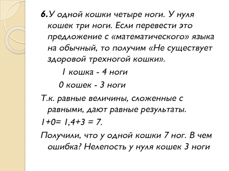 Получили, что у одной кошки 7 ног. В чем ошибка? Нелепость у нуля кошек 3 ноги