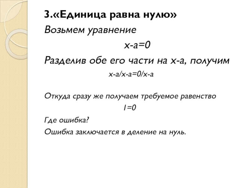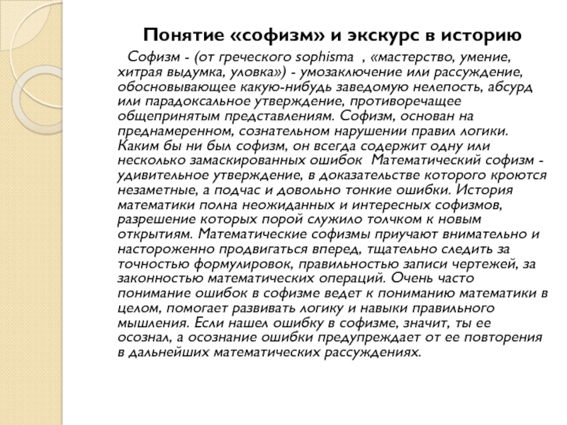 Софизм - (от греческого sophisma , «мастерство, умение, хитрая выдумка, уловка») - умозаключение или рассуждение, обосновывающее какую-нибудь заведомую нелепость, абсурд или парадоксальное утверждение, противоречащее общепринятым представлениям. Софизм, основан на преднамеренном, сознательном нарушении правил логики. Каким бы ни был софизм, он всегда содержит одну или несколько замаскированных ошибок Математический софизм - удивительное утверждение, в доказательстве которого кроются незаметные, а подчас и довольно тонкие ошибки. История математики полна неожиданных и интересных софизмов, разрешение которых порой служило толчком к новым открытиям. Математические софизмы приучают внимательно и настороженно продвигаться вперед, тщательно следить за точностью формулировок, правильностью записи чертежей, за законностью математических операций. Очень часто понимание ошибок в софизме ведет к пониманию математики в целом, помогает развивать логику и навыки правильного мышления. Если нашел ошибку в софизме, значит, ты ее осознал, а осознание ошибки предупреждает от ее повторения в дальнейших математических рассуждениях.
